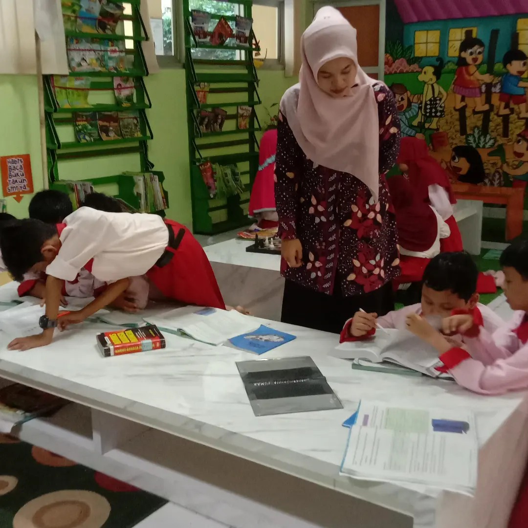 Para siswa kelas 4A didampingi Guru kelas Ibu Chaesara Pahleva,S.Pd."" Pembelajaran Mencari Arti Kata di KBBI."" DiPerpustakaan Mutiara Ilmu